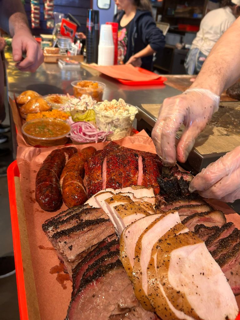 First stop had to be Stiles Switch. We were greeted by old friends, Dwayne, Shane (the owner) & Jose! We got in line for barbecue and were welcomed in by a crowd of state troopers enjoying their own BBQ feasts. Trays were loaded with; brisket, double smoked brisket sausages, spare ribs, pork belly burnt ends & smoked picanha with chimmichuri. For the sides, potato salad, slaw, tater tots, corn casserole & braised brussel sprouts. We’d have gone back for seconds if we could’ve!