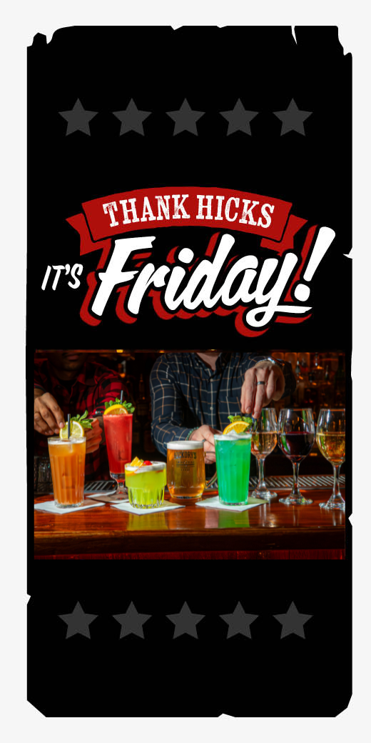 What better way to celebrate the end of the week & say "Thank Hicks it's Friday" than listening to the sounds of the Deep South, from our Hickory's playlist to live music, with a drink (or two) in hand!